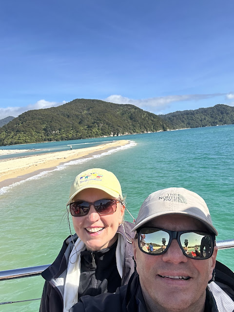 The tour we embarked on was titled by Wilsons as the “Vista Great Day Out.” It included bus pickup in Nelson, drive to and from Kaiteriteri, a boat tour 4-5 hours that went up along the coast in Abel Tasman Park to Totaranui and then back to Tonga Quarry, where it dropped us off. After the boat tour dropped us off we walked through rain forest, over swing bridges to a couple of waterfalls and beaches, the second of which is Medlands Beach, where the boat picked us up for the boat ride back to Kaiterteri. The boat ride was of the scenic coastline of Abel Tasman park. The walk was about 3 miles. As part of the tour we had purchased a picnic lunch that we enjoyed beside the beach after the boat dropped us off for our hike.